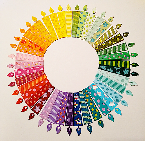 Der Clou der Karte ist, dass sich der Kerzenkreis drehen kann. Dafür habe ich zu Beginn die einzelnen Kerzen zu einem Kreis gelegt. So konnte ich die unterschiedlichen Kreise gut ausmessen und gleichzeitig sehen, in welcher Größe die Schrift und die „40“ am besten wirken.